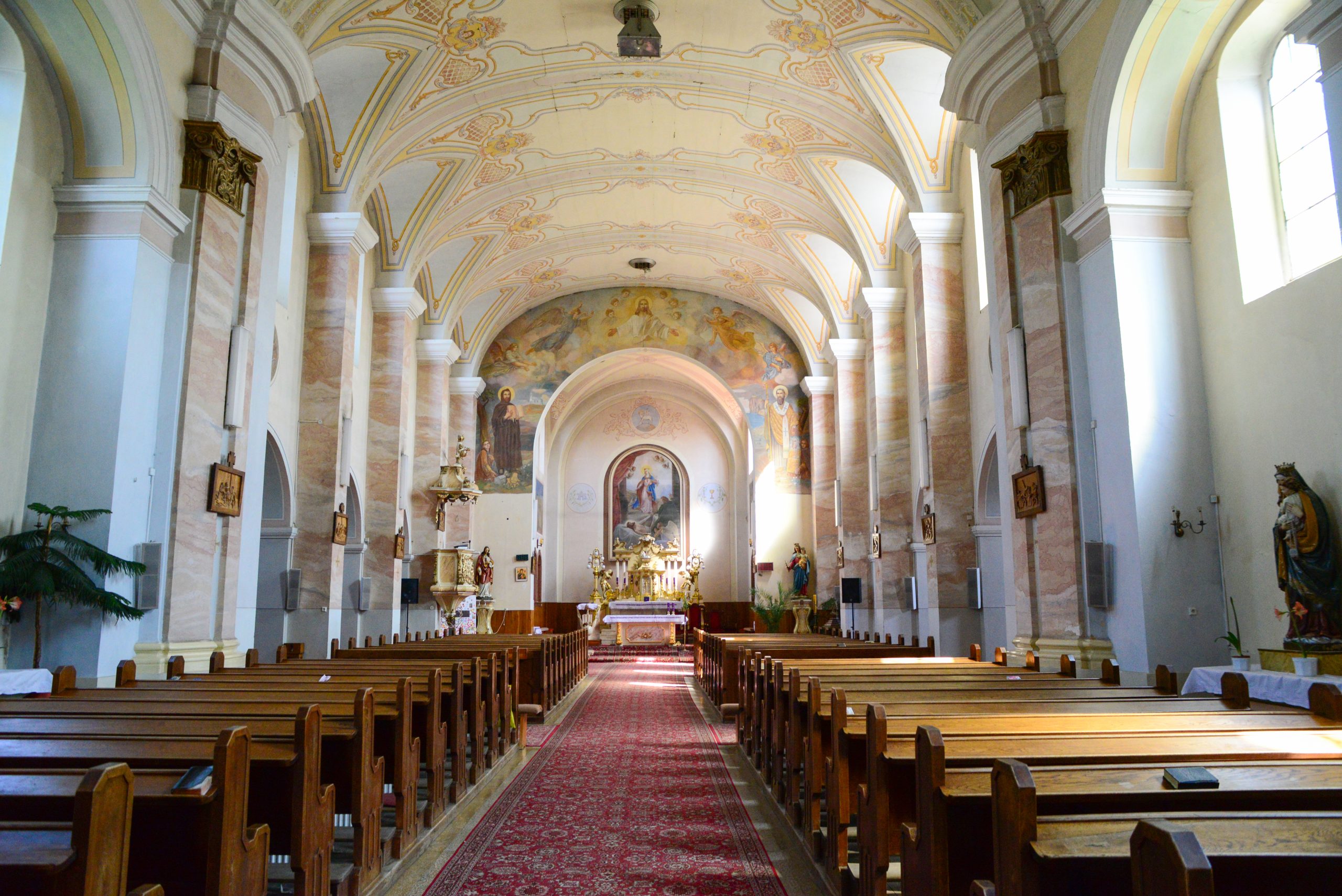 Z architektonického hľadiska má kostol plocho uzavreté presbytérium, ku ktorému sa po stranách pripája sakristia, ktorá má vchod zvonka. Hlavná loď je otvorená do bočných lodí. Chór ja vstavaný na štyroch štvorcových pilieroch. Veža je vstavaná, štvorcová.